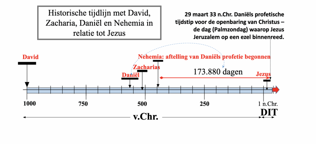 Door de resterende 25 dagen van Daniëls profetische tijd op te tellen bij 4 maart 33 n.Chr. komen we op 29 maart 33 n.Chr. Dit wordt weergegeven in de tabel en geïllustreerd in de onderstaande tijdlijn.