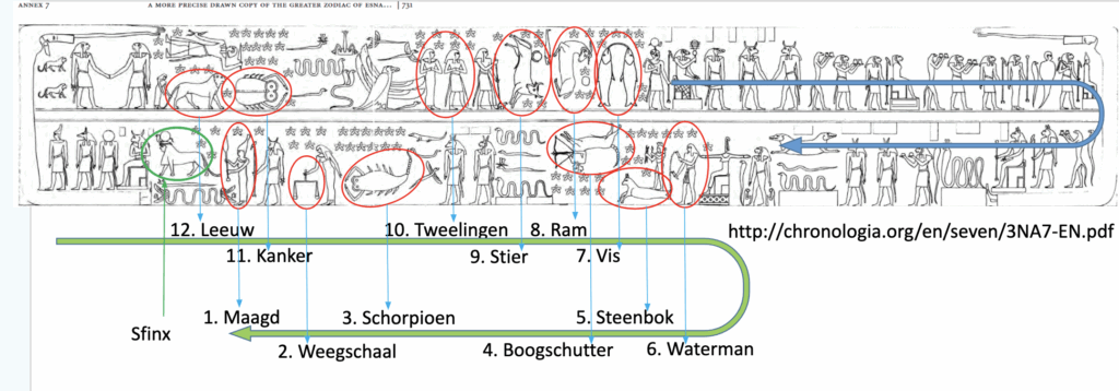 De lineaire dierenriem op de zuilengang van de Tempel van Esna. De sterrenbeelden zijn rood omcirkeld. De Sfinx (groen omcirkeld) loopt voorop in de dierenriemprocessie. Maagd begint de processie en Leeuw is de laatste.